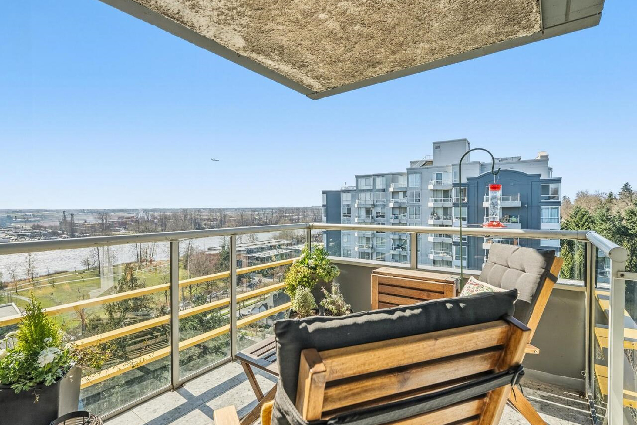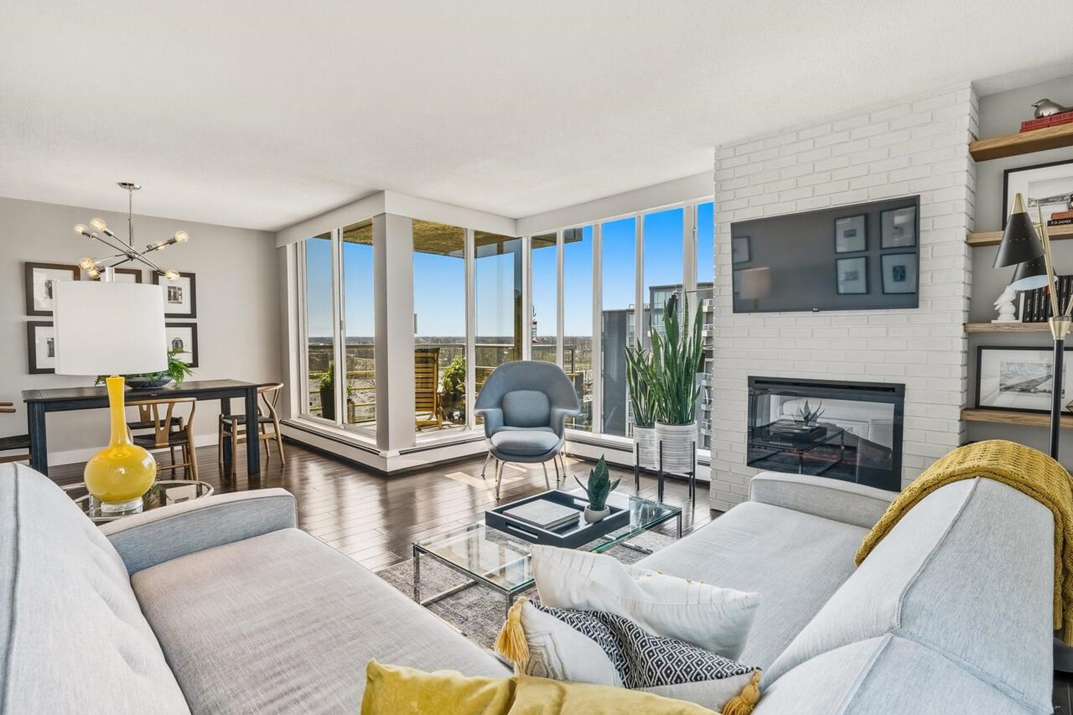 Impressive lobby leads to rich dark hardwood floors and a curved foyer opening to bright dining and spacious living areas with a brick-style mantle and electric fireplace. Floor-to-ceiling windows capture stunning southwest Fraser River views, with two corner sliding doors to a covered deck for sunsets and outdoor living. Kitchen features butcher block counters, stainless steel appliances and white cabinetry. Second balcony off the kitchen and bedroom overlooks the treed Fraserview Golf Course. Large primary bedroom with walk-in closet and spa-like ensuite with soaker tub and glass shower. Updated main bathroom. Amenities include indoor swimming pool, hot tub, gym, and multipurpose room. 3 side-by-side parking plus a storage locker included. 2 pets allowed. Steps to Riverfront Park and 15-minute walk to the River District shops and cafes.