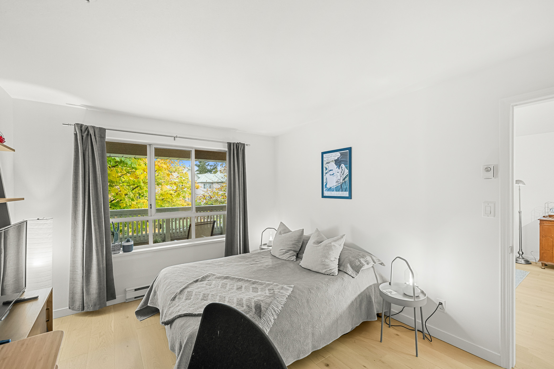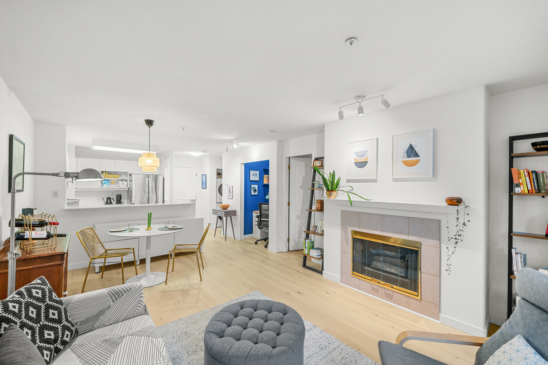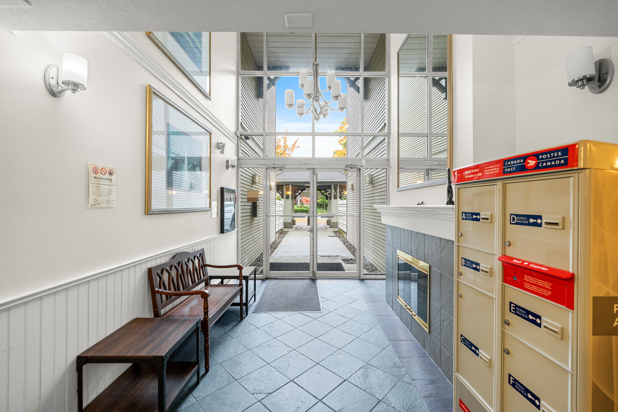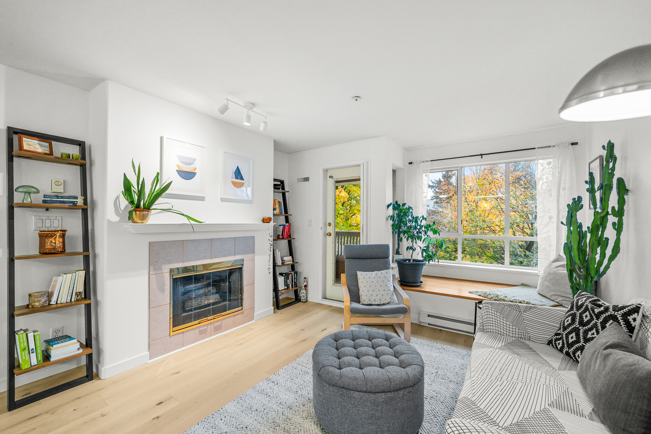 Saltspring Building. This exceptional one-bedroom residence offers a perfect blend of comfort, style, and convenience. This bright and sunny unit boasts a fantastic open layout, maximizing space efficiency, and offers a serene southwest outlook towards a quiet cul-de-sac and treed setting. Enjoy a spacious patio, beautiful engineered light oak flooring throughout, a cozy fireplace, and an extra-large window seat perfect for reading or relaxation. It provides ample dining room space, a dedicated work-from-home desk nook, and convenient in-suite laundry. The tastefully updated kitchen is a chef’s delight, featuring Caesarstone quartz counters with a bar stool overhang, quality stainless steel LG appliances (fridge, stove, and dishwasher), and abundant counter and cupboard space for all your culinary needs. The sleekly renovated bathroom offers a spa-like experience with quartz countertops, elegant Riobel fixtures, a deep soaker tub, and extra storage for toiletries. The very spacious bedroom is complimented by a large picture window, a convenient walk-through “his and hers” closet with organizers, and a pocket door for direct access to the bathroom.