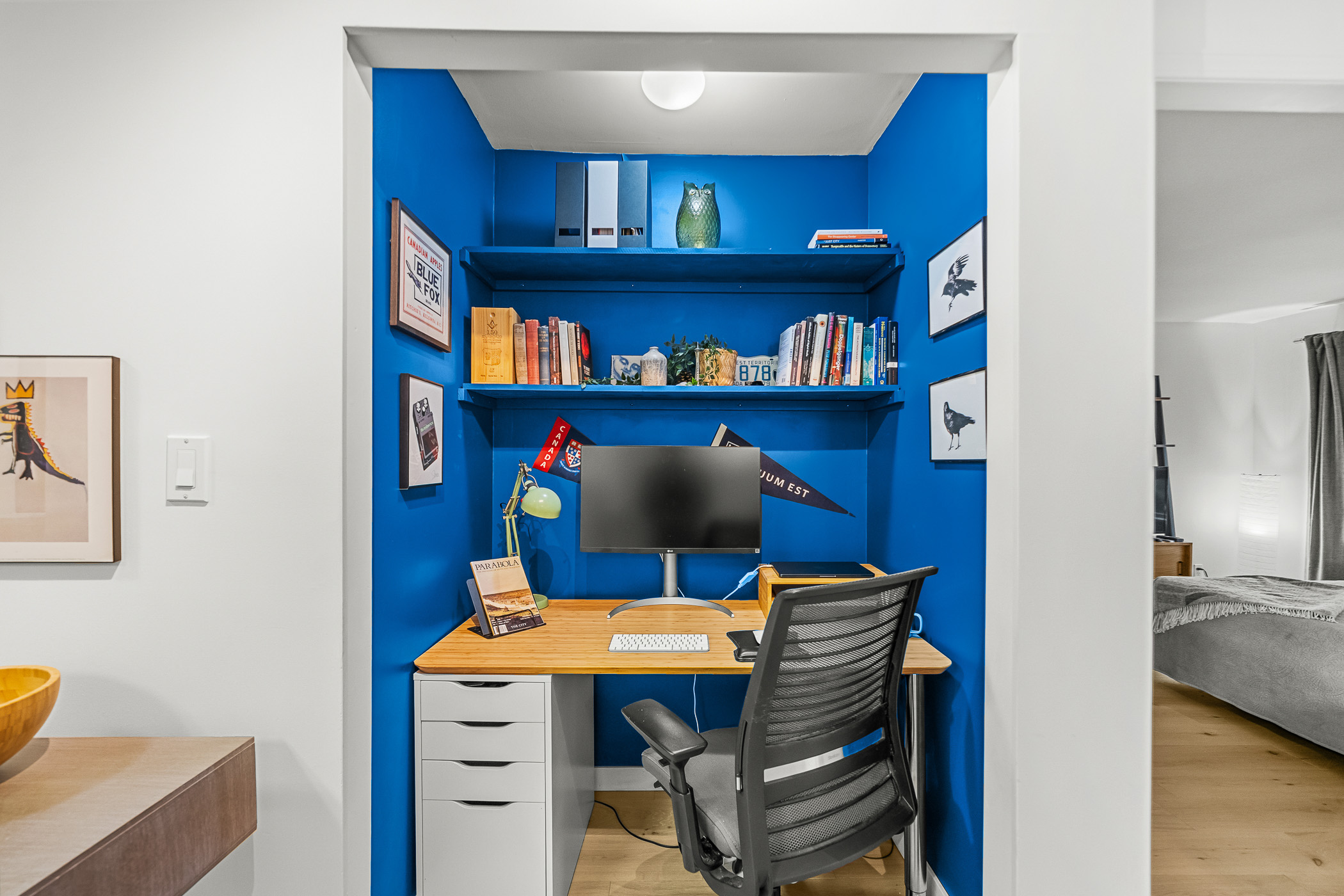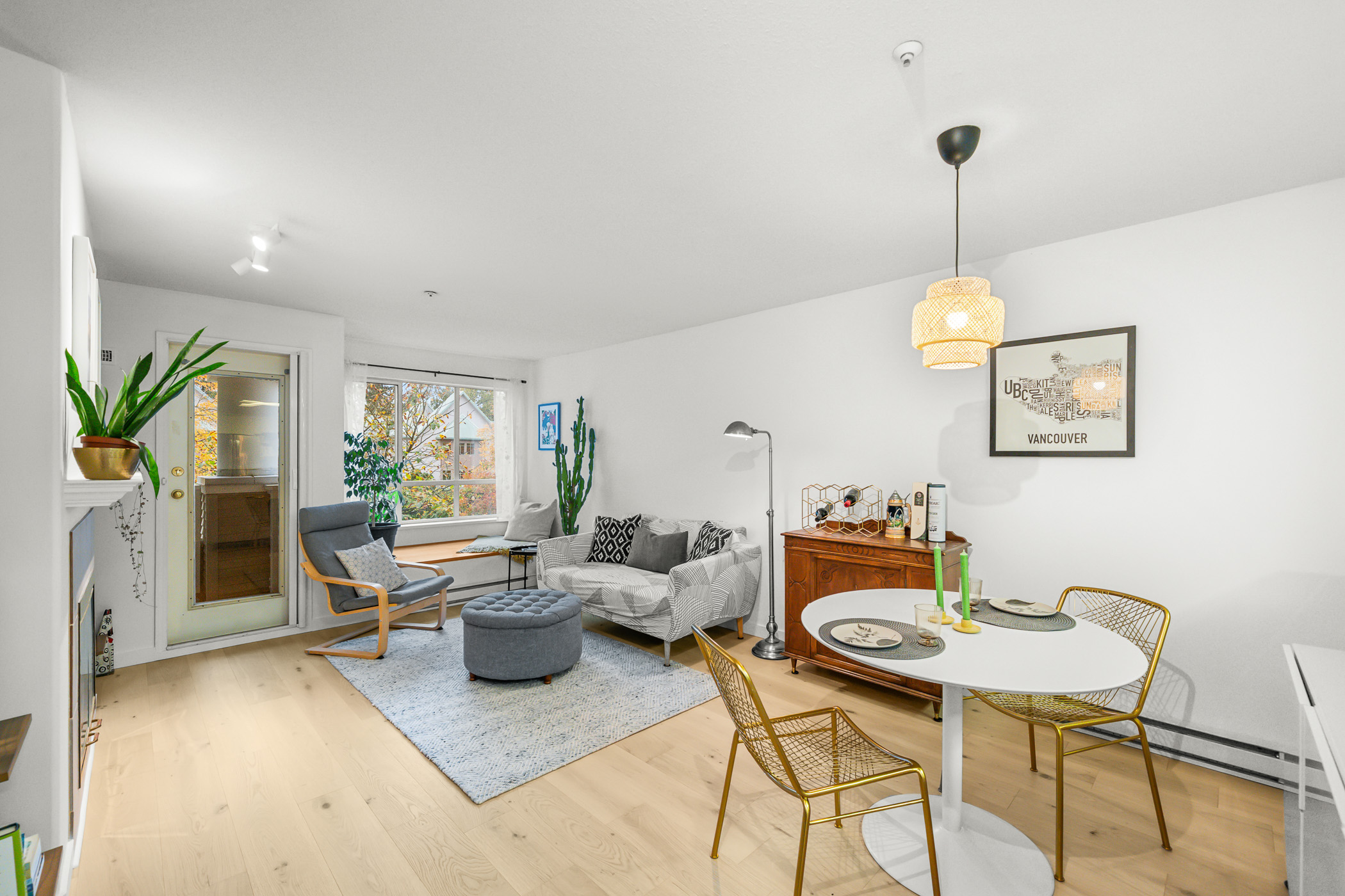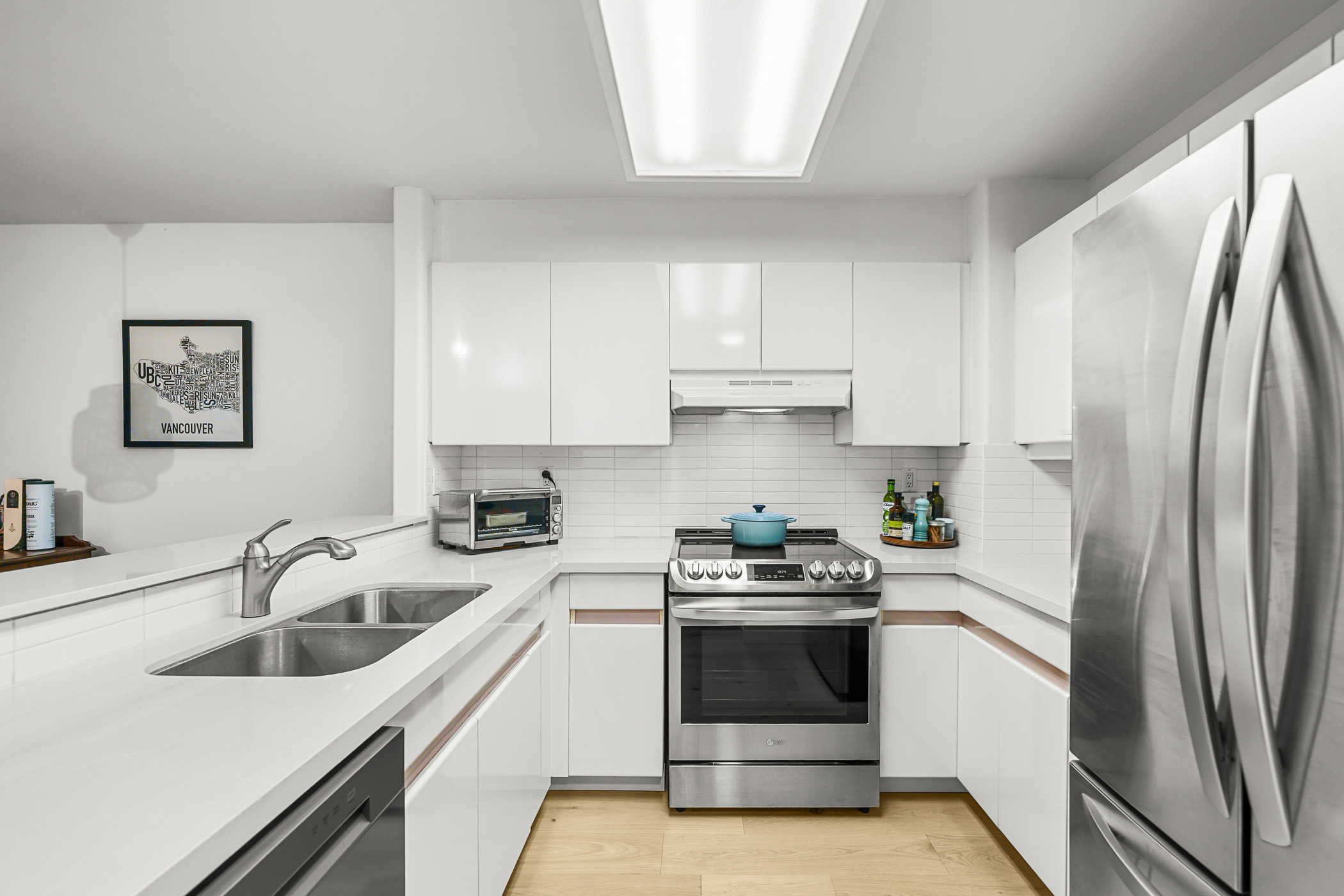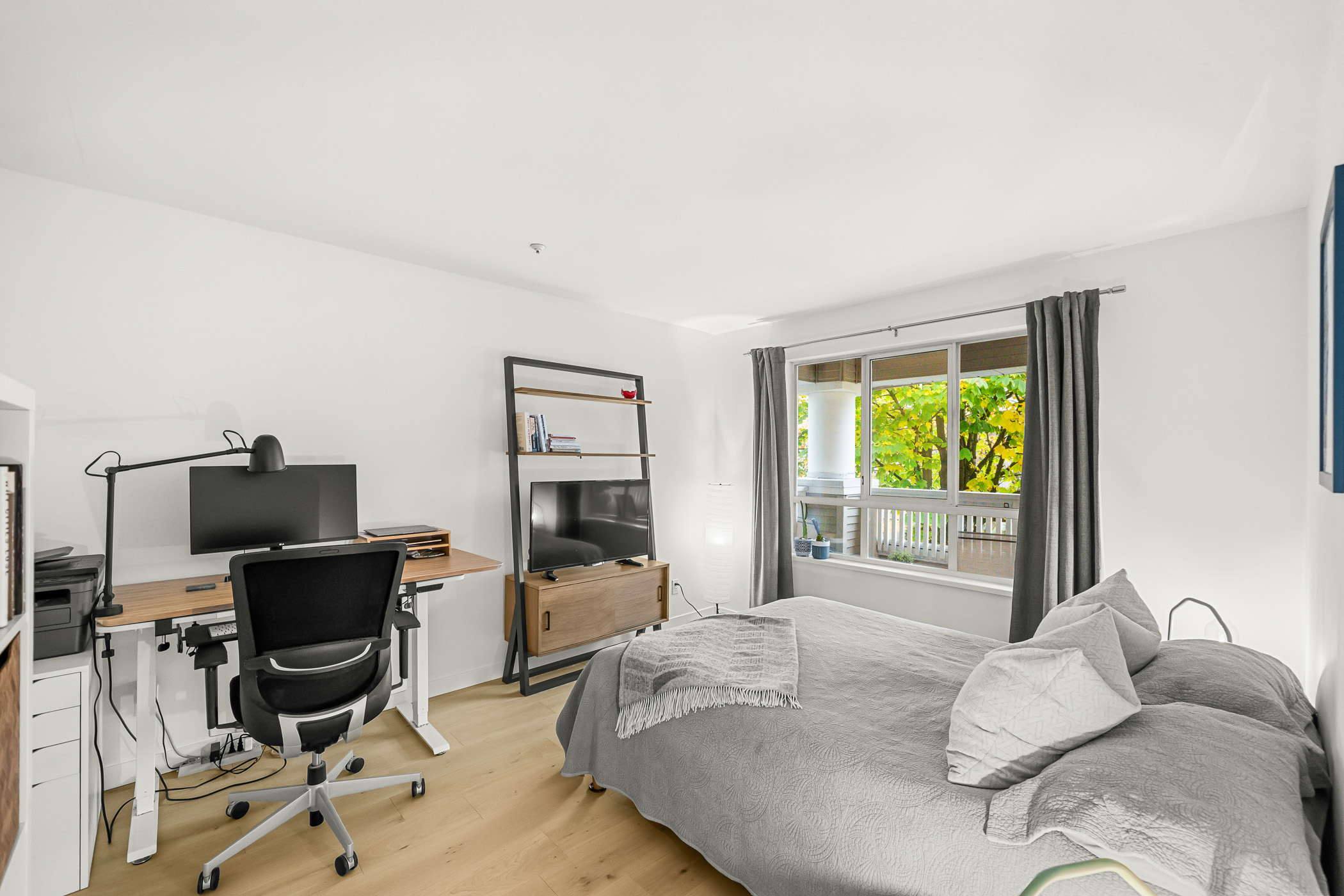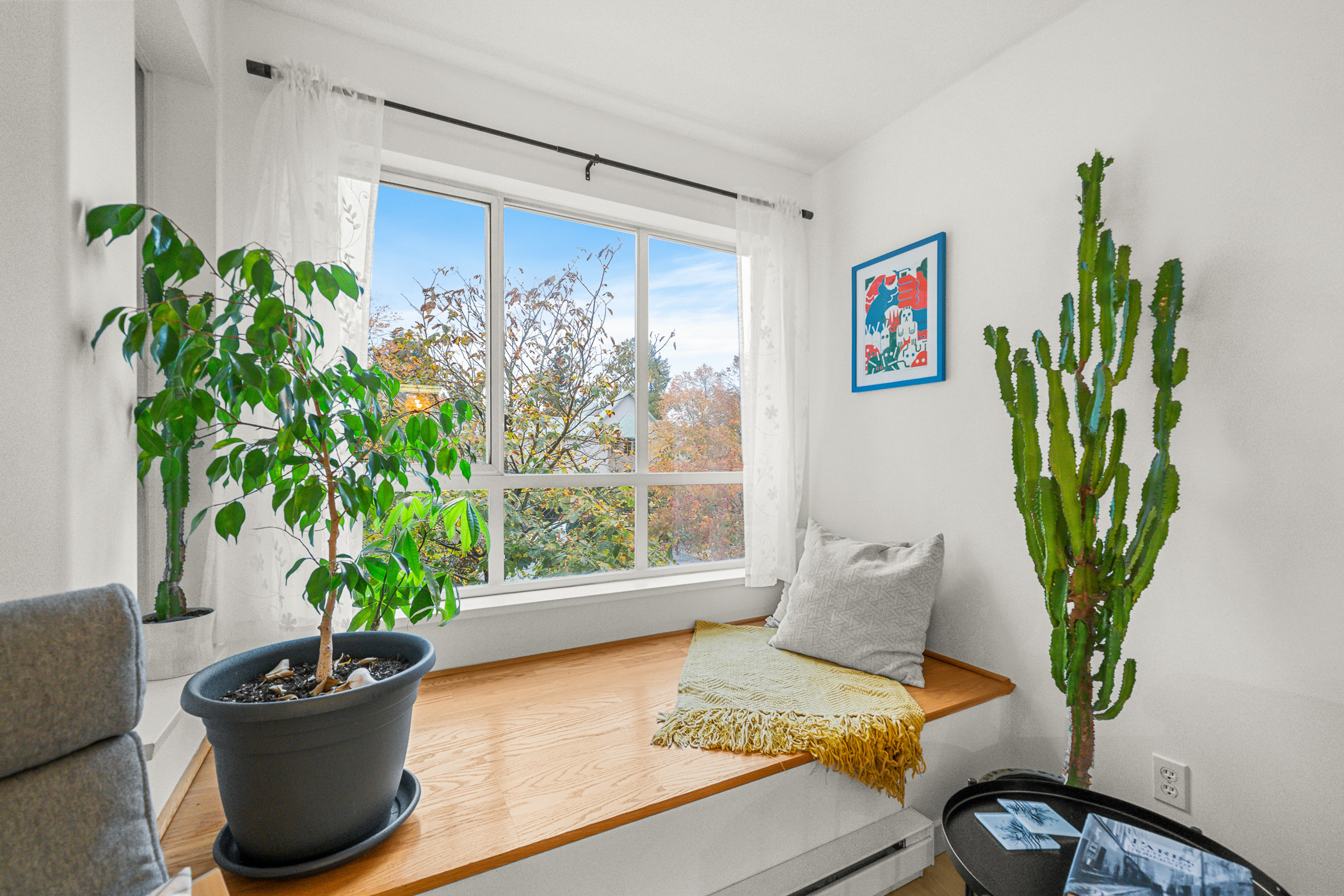 Saltspring Building. This exceptional one-bedroom residence offers a perfect blend of comfort, style, and convenience. This bright and sunny unit boasts a fantastic open layout, maximizing space efficiency, and offers a serene southwest outlook towards a quiet cul-de-sac and treed setting. Enjoy a spacious patio, beautiful engineered light oak flooring throughout, a cozy fireplace, and an extra-large window seat perfect for reading or relaxation. It provides ample dining room space, a dedicated work-from-home desk nook, and convenient in-suite laundry. The tastefully updated kitchen is a chef’s delight, featuring Caesarstone quartz counters with a bar stool overhang, quality stainless steel LG appliances (fridge, stove, and dishwasher), and abundant counter and cupboard space for all your culinary needs. The sleekly renovated bathroom offers a spa-like experience with quartz countertops, elegant Riobel fixtures, a deep soaker tub, and extra storage for toiletries. The very spacious bedroom is complimented by a large picture window, a convenient walk-through “his and hers” closet with organizers, and a pocket door for direct access to the bathroom.