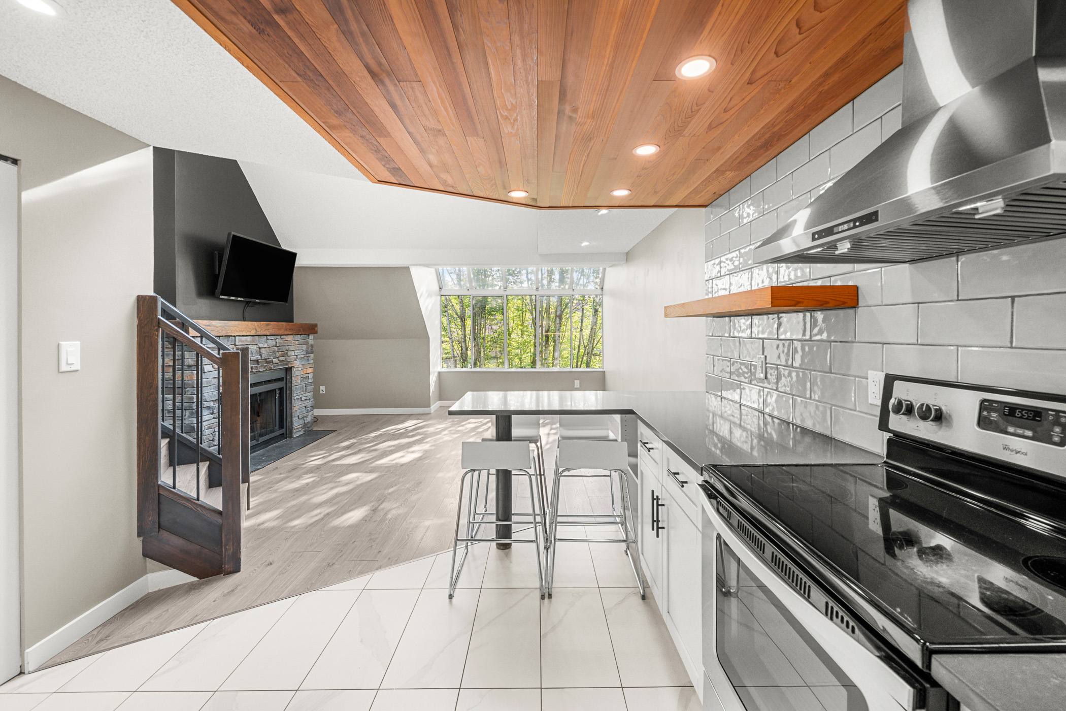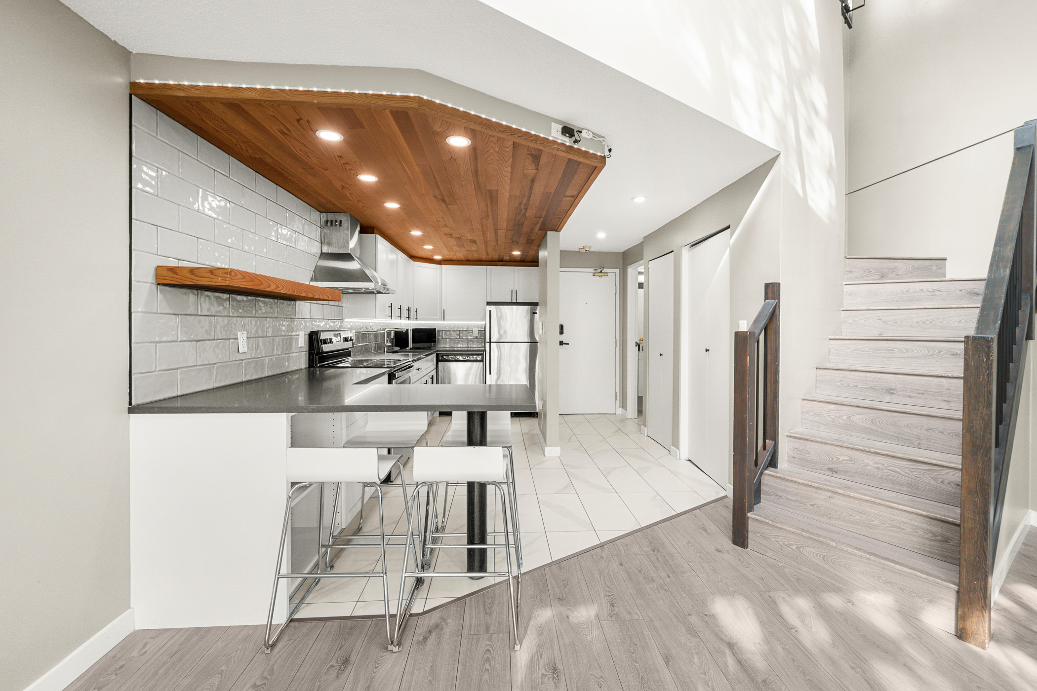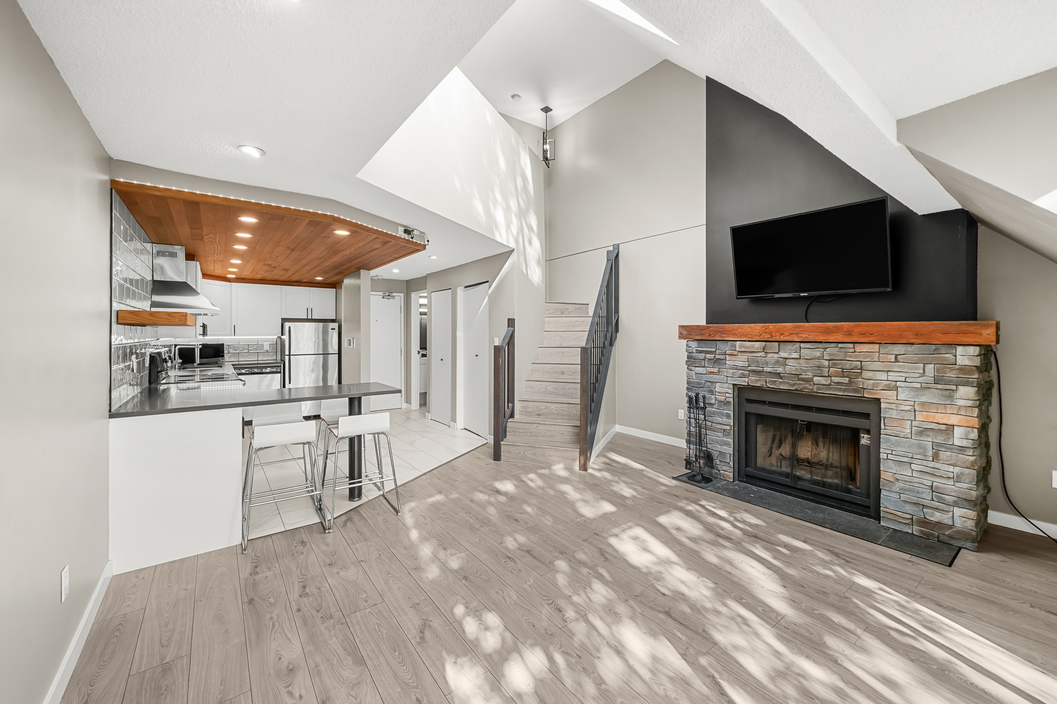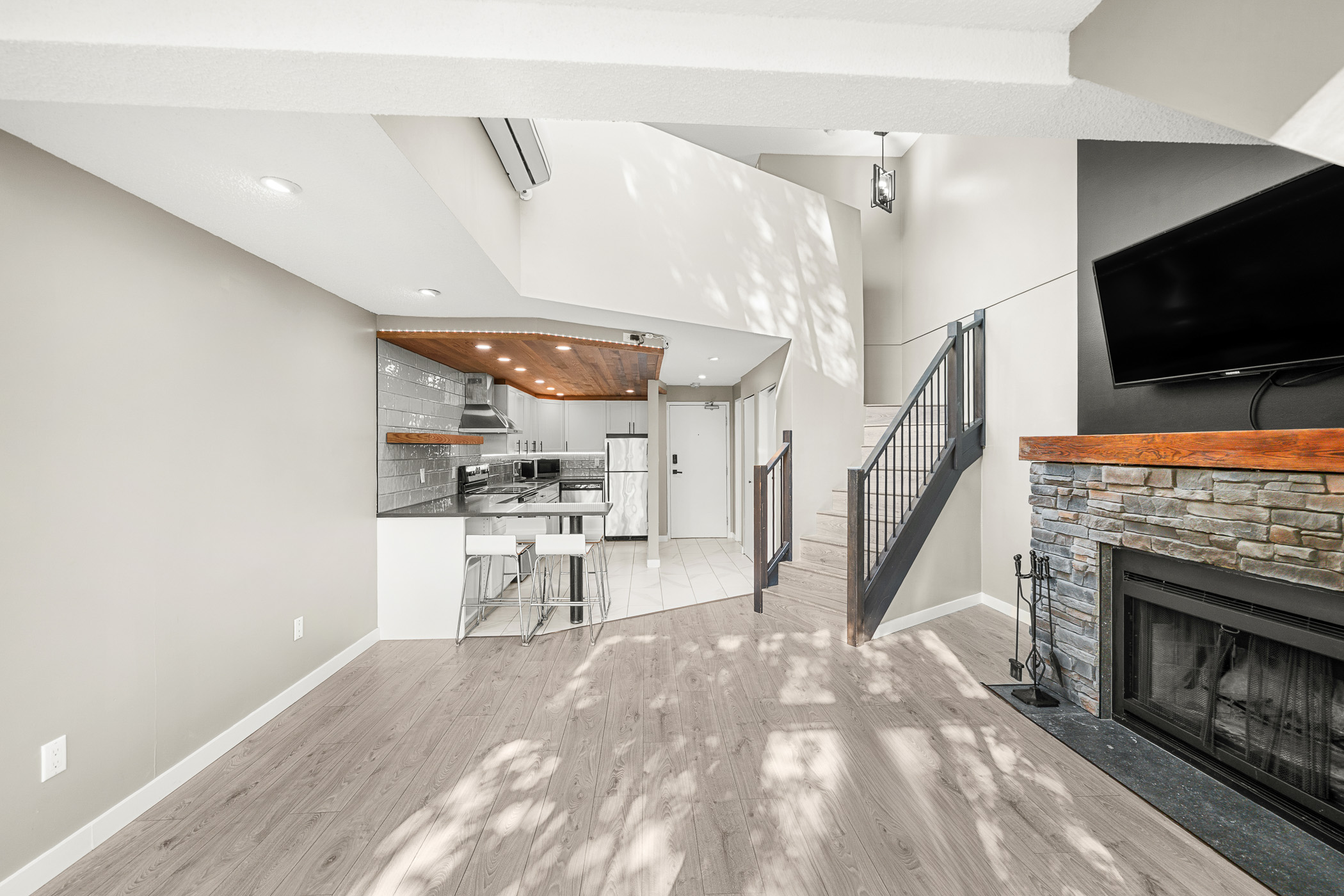 Experience Soho living in the heart of Richmond with this one bedroom, two bathroom unique space. Impeccably renovated, this open floor plan loft in the heart of Richmond is a first time home buyers dream. Beautiful finishes include a gourmet chef’s kitchen complete with stainless steel appliances, shaker cabinets, subway backsplash, stone countertops, a gorgeous inlaid hardwood ceiling complete with pot lighting and tile flooring. The living area boasts soaring vaulted ceilings, a feature wood burning fireplace with stone accents, laminate flooring, pot lighting. The bathroom has also been completely renovated. The primary bedroom is an open loft with accent wall, electric fireplace, open closet design and an updated ensuite bathroom. This unit also comes with air conditioning, in suite laundry, in-suite storage, private rooftop patio off the primary bedroom and parking.